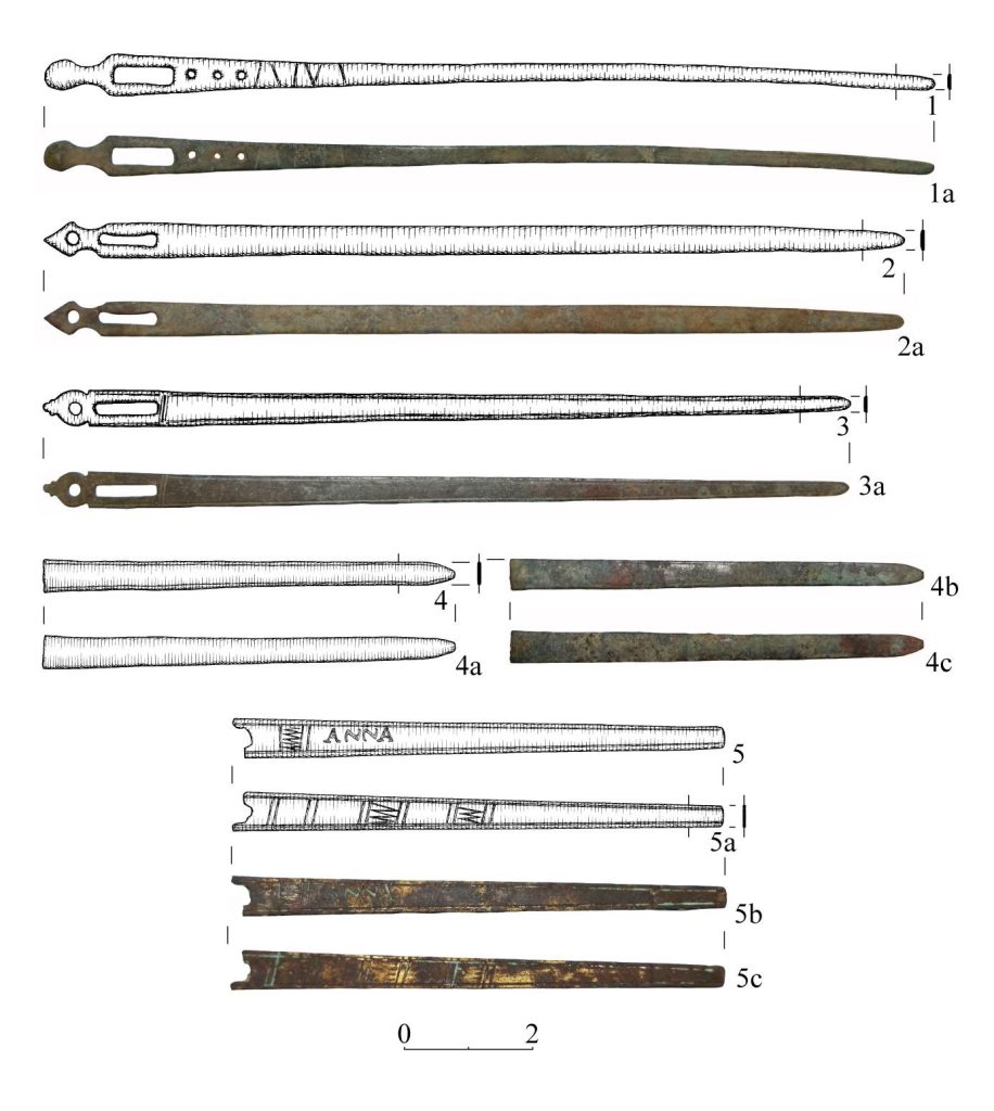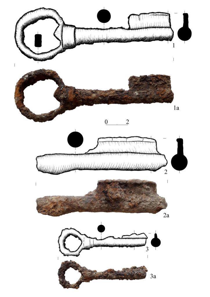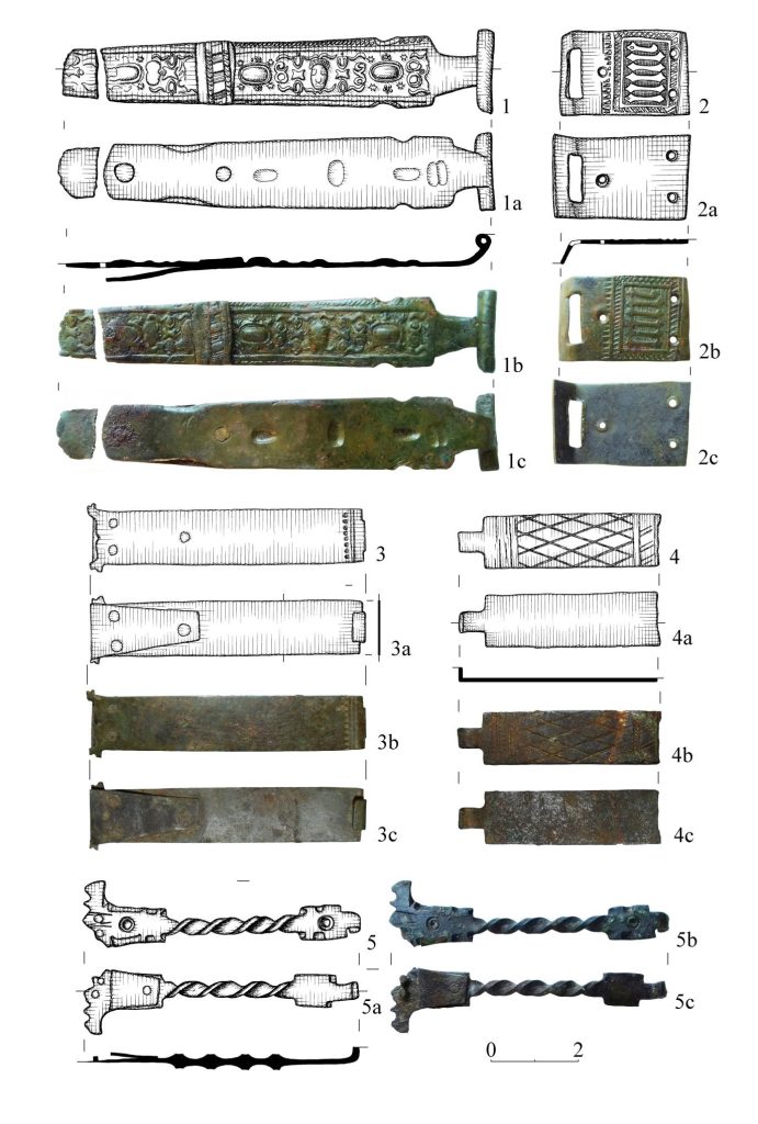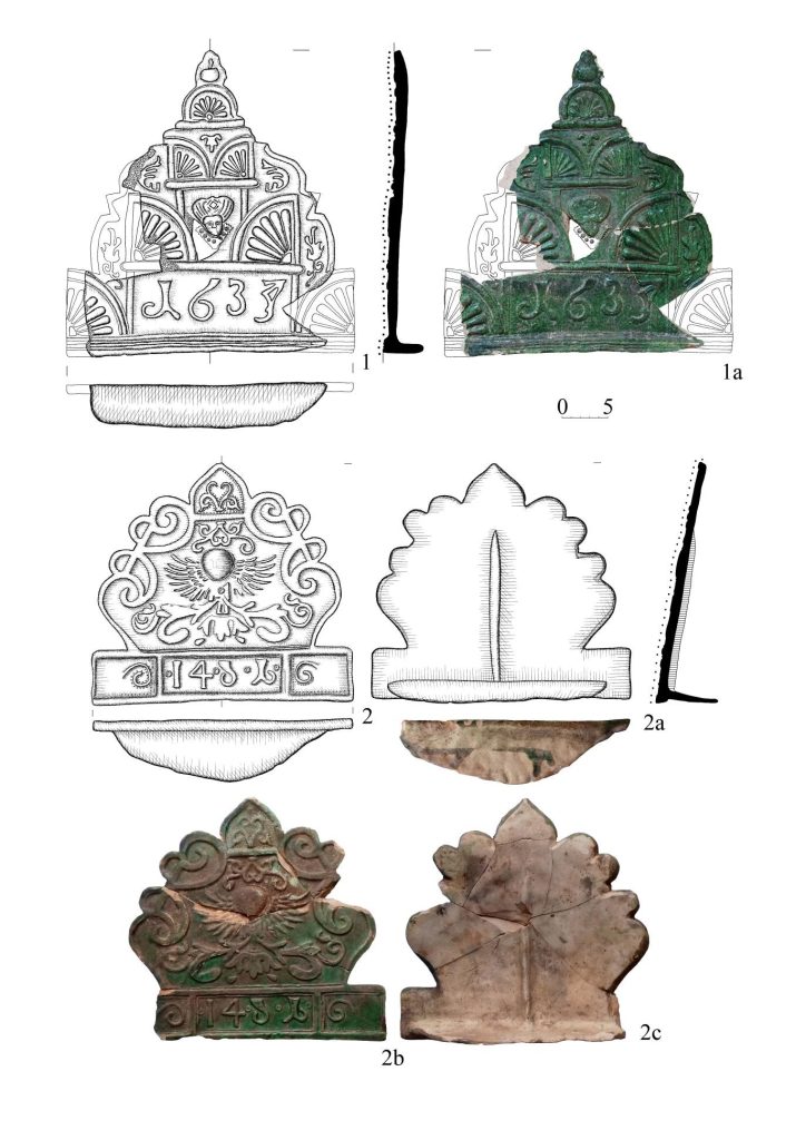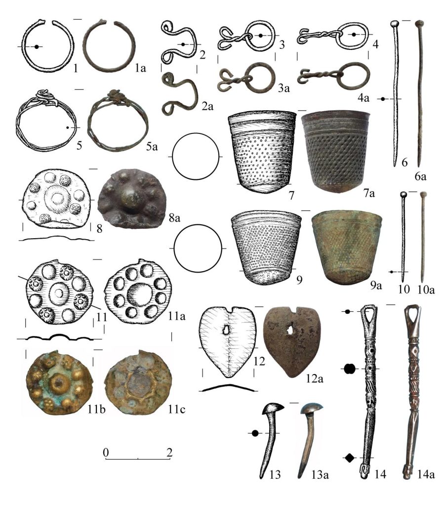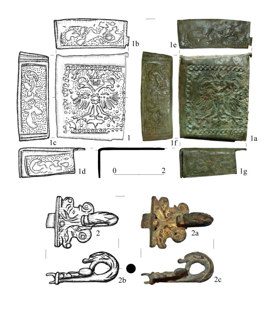 У горизонті XVI–XVII ст. знайдена ціла серія дрібних бронзових виробів, в тому числі уламки стрілок від настінного годинника і ковані елементи обкладинок книжок, прикрашені геометричним, рослинним, антропоморфним та зооморфним декором. Одна книжкова оковка з боків гравірована рослинним декором, а в центрі зображення – коронований двоголовий австрійський орел. Ще одна мідна застібка зі слідами позолоти оздоблена головою лебедя.