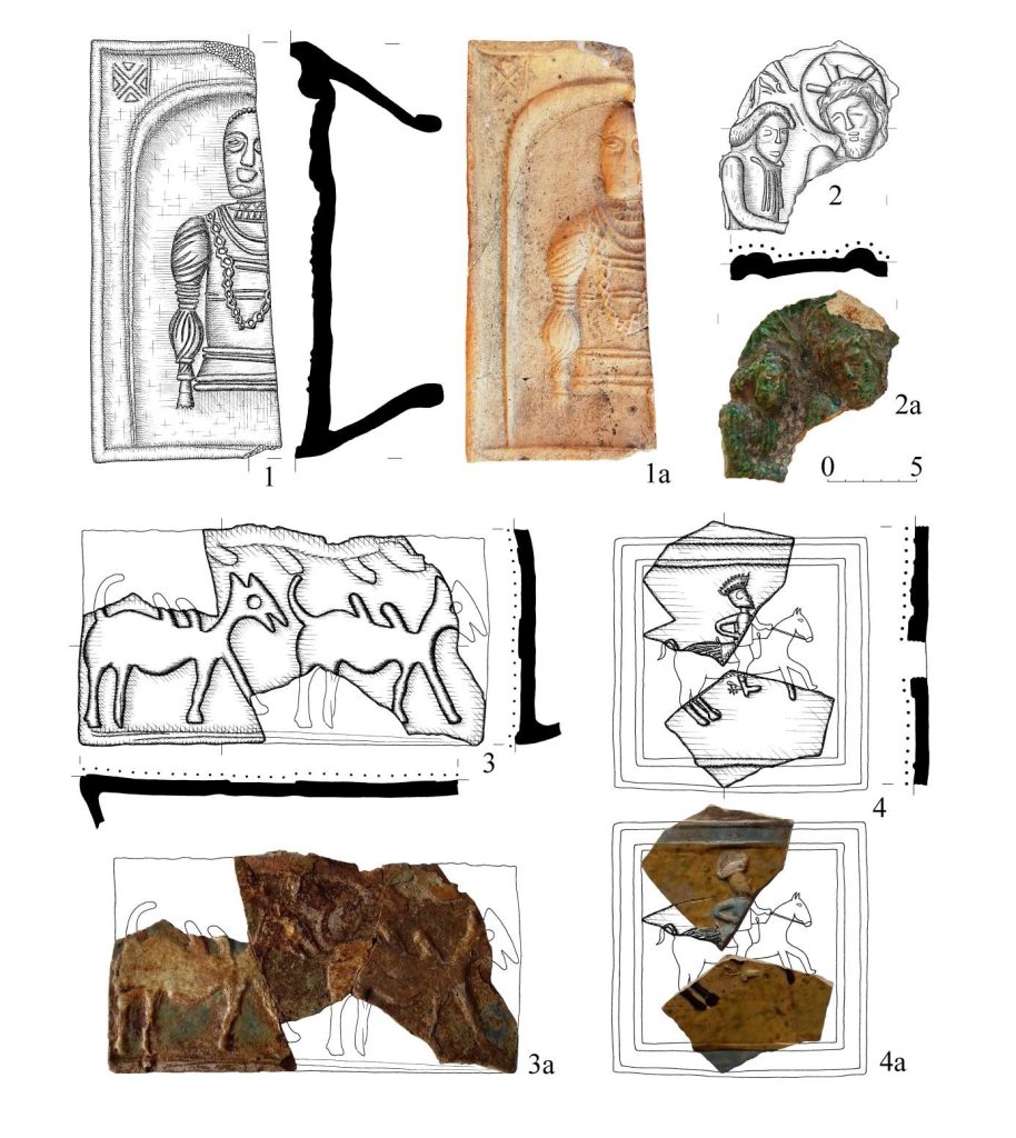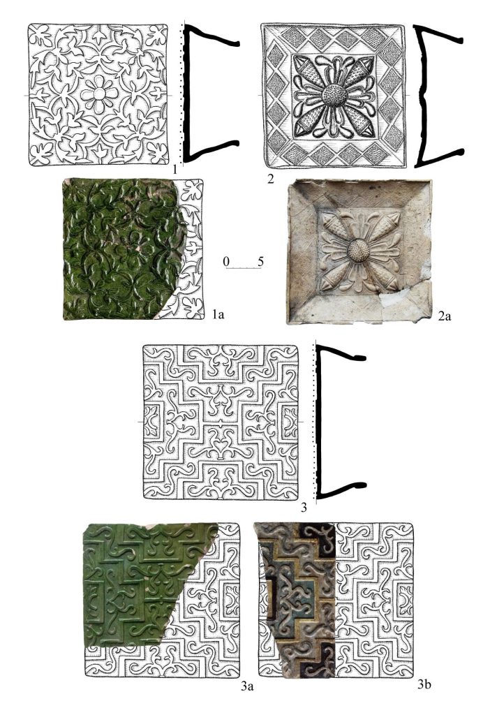 Кахлі поділяються на три великі групи: екземпляри без поливи, вкриті глазур’ю зеленого кольору плитки і фрагменти з поліхромним розписом. Для оформлення середнянських печей було характерне використання різноманітних комбінацій геометричного та рослинного декору. В його доповнення в конструкціях печей XVII ст. використовувалися плитки із зображенням русалок, а також екземпляри, що оздоблювали верхівку печі з жіночим обличчям і цифрами 1637 або стилізованим образом янгола і цифрами 1632 та 1451. Серед знахідок кахлів реалістичністю зображення виділяються два екземпляри XVI ст. На одному з них відтворений аристократ, одягнутий за тогочасною модою з нагрудною прикрасою, що підтверджує його високий соціальний статус. На другій плитці – постать Ісуса Христа з страждальним виразом обличчя, якого підтримує янгол. Аналогії останній відомі з Королівського замку Нялаб і пам’яток на території Румунії. Окремо відзначимо уламки двох поліхромних кахляних плиток. Одна розмальована жовтою, блакитною, коричневою та білою фарбами. На ній зображений вершник в тюрбані. Другий екземпляр в композиції включав двох тварин, які нагадують верблюдів. Кахля вкрита глазур’ю білого, блакитного та жовтого кольорів.