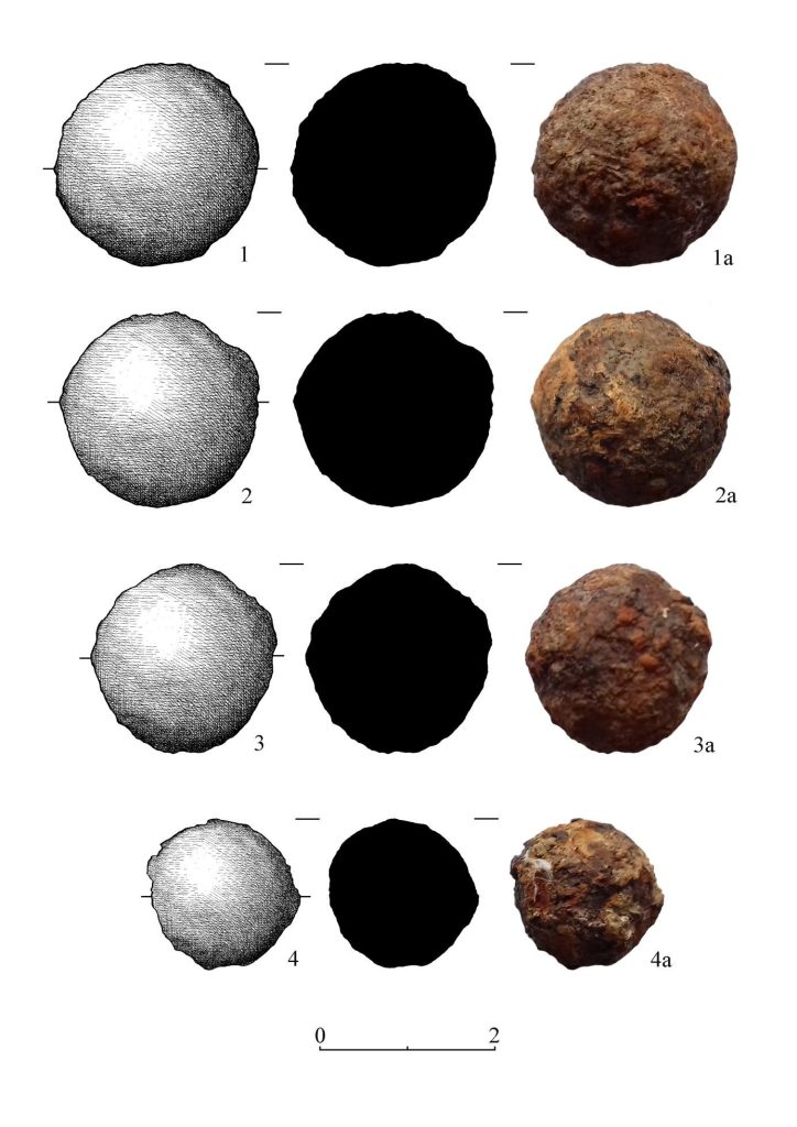 Предмети озброєння представлені свинцевими кулями для рушниць діаметром до 1 см, залізними кулями діаметром до 1,5 см і ядрами від гармат малого калібру (4,5 см). Дана зброя датується XVIІ ст. і відноситься до завершального етапу функціонування замку. Окремо відзначимо знахідку елемента замка рушниці цього ж хронологічного зрізу, який дозволяє конкретизувати типологію комплекту озброєння місцевих солдат.